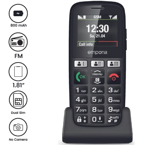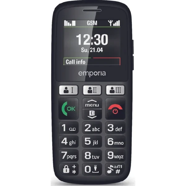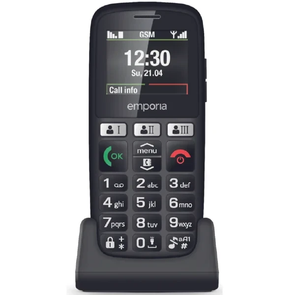 The Emporia Happy is a robust mobile phone designed for seniors, featuring a bright color display, large illuminated buttons, and high-volume sound. It includes 3 quick-call buttons for easy dialing, Bluetooth connectivity, and comes with a convenient charging station for effortless use.