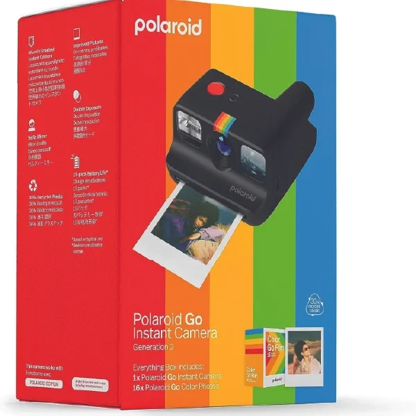 The Polaroid Go Generation 2 Everything Box is a compact instant camera kit designed for on-the-go creativity. It features a wide aperture range, precise light sensor, and user-friendly exposure settings for enhanced photo quality. The kit includes a 16-shot Polaroid Go Color Film pack, USB-C charging cable, and wrist strap, all housed in a classic design made with 30% recycled materials. With features like a selfie mirror, self-timer, and double exposure mode, it's perfect for capturing spontaneous moments.