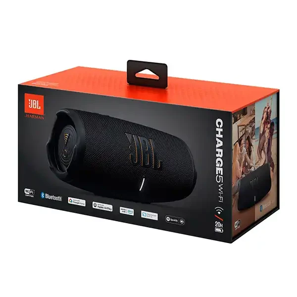 Go anywhere, hear anything. The bold JBL Original Pro Sound and deep bass of the JBL Charge 5 Wi-Fi and Bluetooth portable speaker keeps you moving to your own personal beat. Stream music anywhere over Wi-Fi, while continue using your phone. Taking a call or scrolling your feed? Go ahead—it won't interrupt your music. Switch easily to Bluetooth and keep enjoying seamless audio experiences whether you're indoors or outside. The waterproof, dustproof portable speaker is powered by 20 hours of battery life whether you're hanging at the park or dancing by the pool, and comes with a handy powerbank to keep your devices charged. Stream music through AirPlay, Alexa Multi-Room Music, Chromecast built-in™ and Spotify Connect. And the eco-friendly design—incorporating recycled fabric and plastic—helps to make any adventure a little greener.