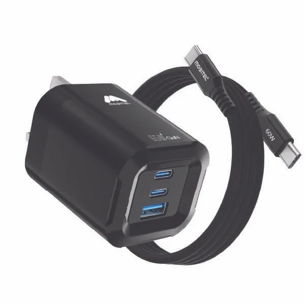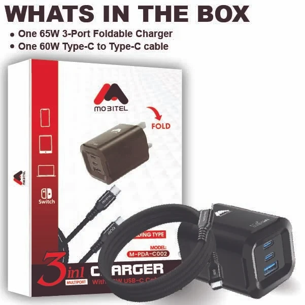 Box Included | 1 x Mobitel 65W 3-in-1 Fast Charger, 1 x 60W Fast USB C-to-C Cable |