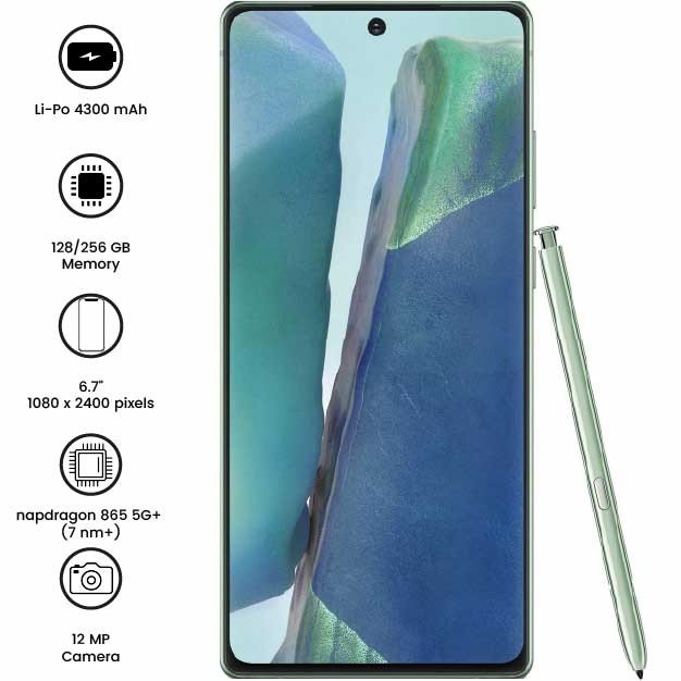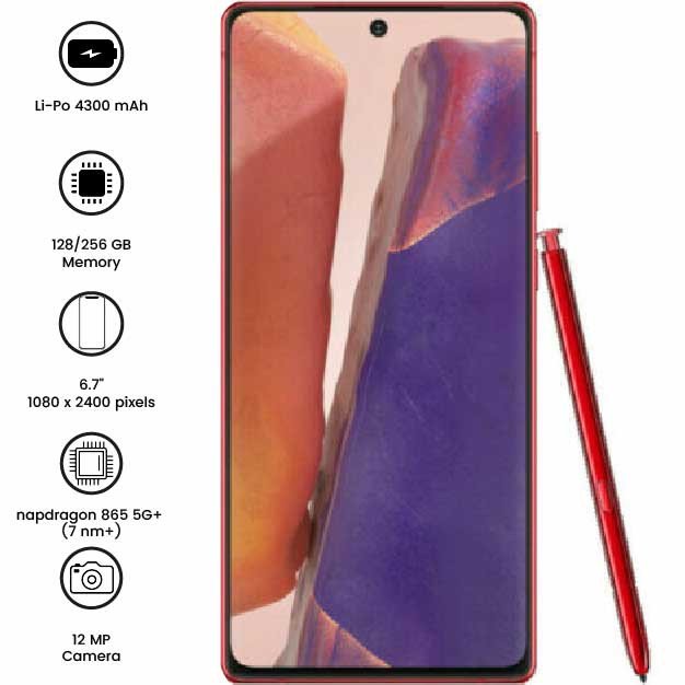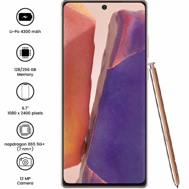The Samsung Galaxy Note20 5G features a 6.7-inch Super AMOLED+ display, Snapdragon 865+ processor, and S Pen support for enhanced productivity. It has a triple-camera setup (64MP main) and a 4,300mAh battery with fast charging. The device supports 5G connectivity for ultra-fast performance.