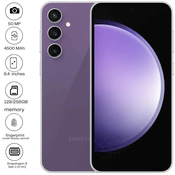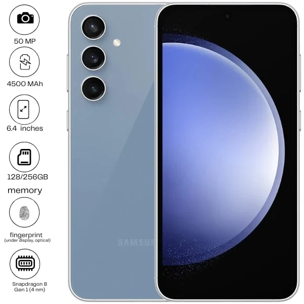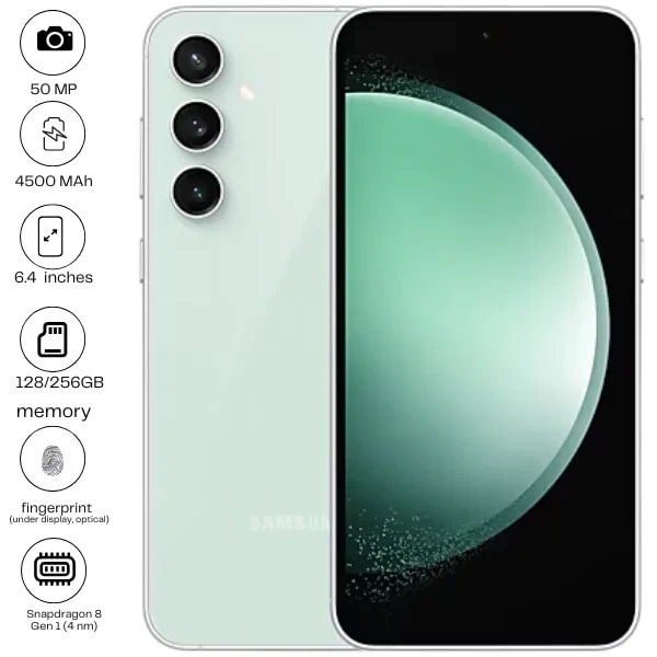The Samsung Galaxy S23 FE features a 6.4-inch 1080x2340 pixel display for vibrant visuals and a 50MP camera with 8K video recording. Powered by a 4500mAh battery, it supports 25W wired and 10W wireless charging for efficient power. A perfect blend of performance and style.