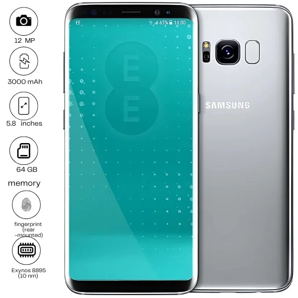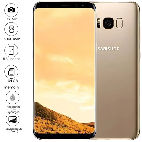 The Samsung Galaxy S8 features a 5.8-inch Quad HD+ Super AMOLED Infinity Display, Exynos 8895 / Snapdragon 835 processor, and Android 7.0 Nougat (upgradable). It has a 12 MP dual-pixel rear camera, 8 MP front camera, and a 3000 mAh battery. The phone supports 4G LTE, Wi-Fi, Bluetooth 5.0, NFC, and IP68 water resistance.