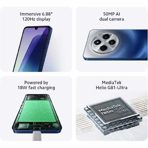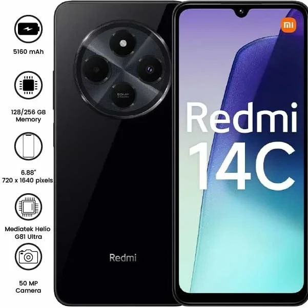 The Xiaomi Redmi 14C is a feature-packed smartphone with 128GB storage, a 6.88" HD+ display (720x1640 pixels), and a powerful 50MP rear camera capable of 1080p video recording. Powered by a 5160mAh battery with 18W fast charging, it’s designed for seamless multitasking and capturing stunning photos on the go.